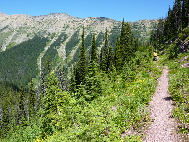 Wir durchqueren riesen Waldstücke wo wir selten Menschen antreffen. Es hat kleine Wanderwege (Singeltracks) die uns weiterbringen. Wasser finden wir überall und es ist wunderschön. Zeitweise radeln wir durch richtige Blumenmeere und brausen kleine Pfade im Tannenwald hinunter. In „Seeley Lake“ gehen wir auf den Camping da wir wiedereinmal. Grosse Reinigung machen muessen und ein Pausetag fällig ist .